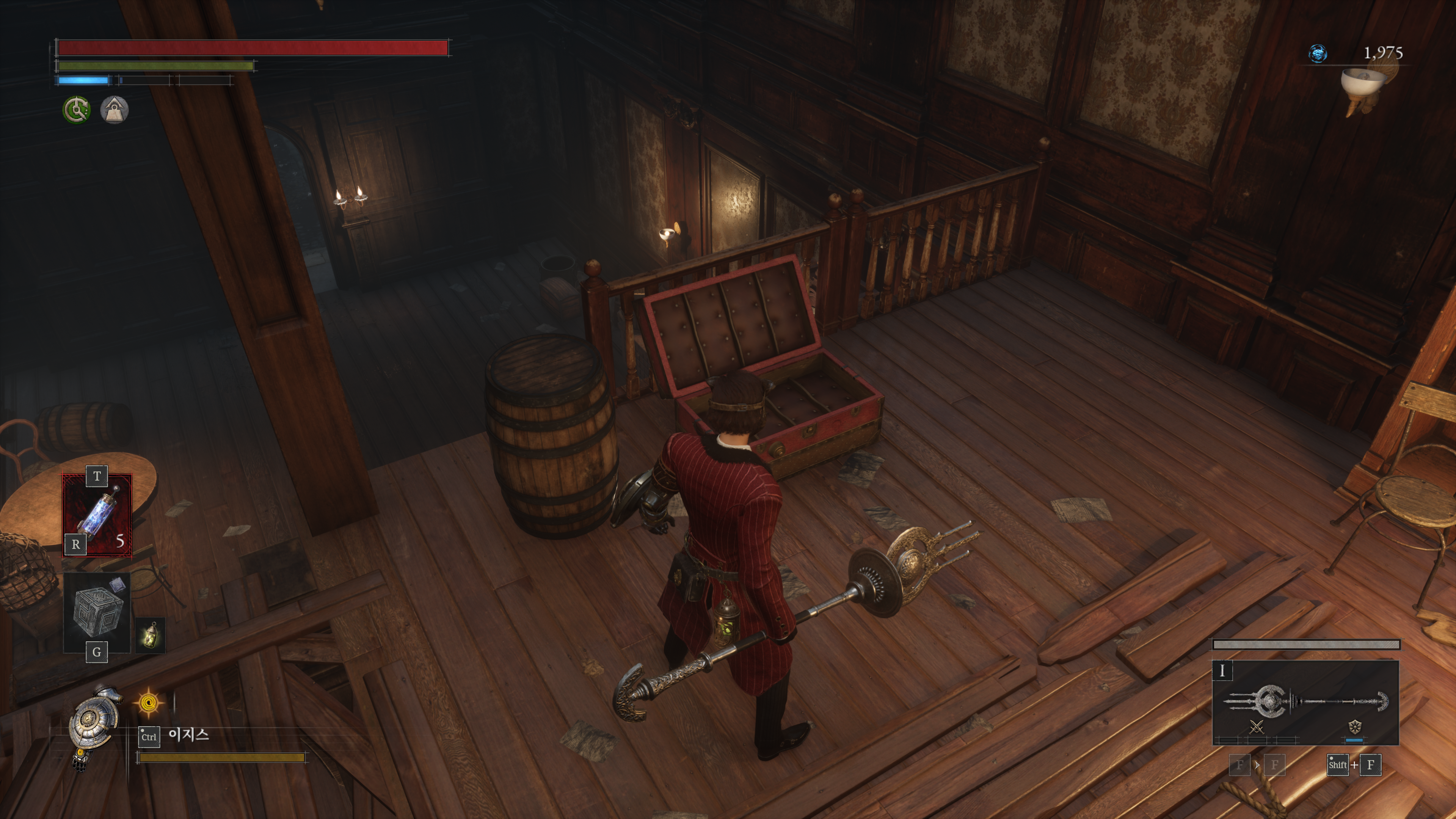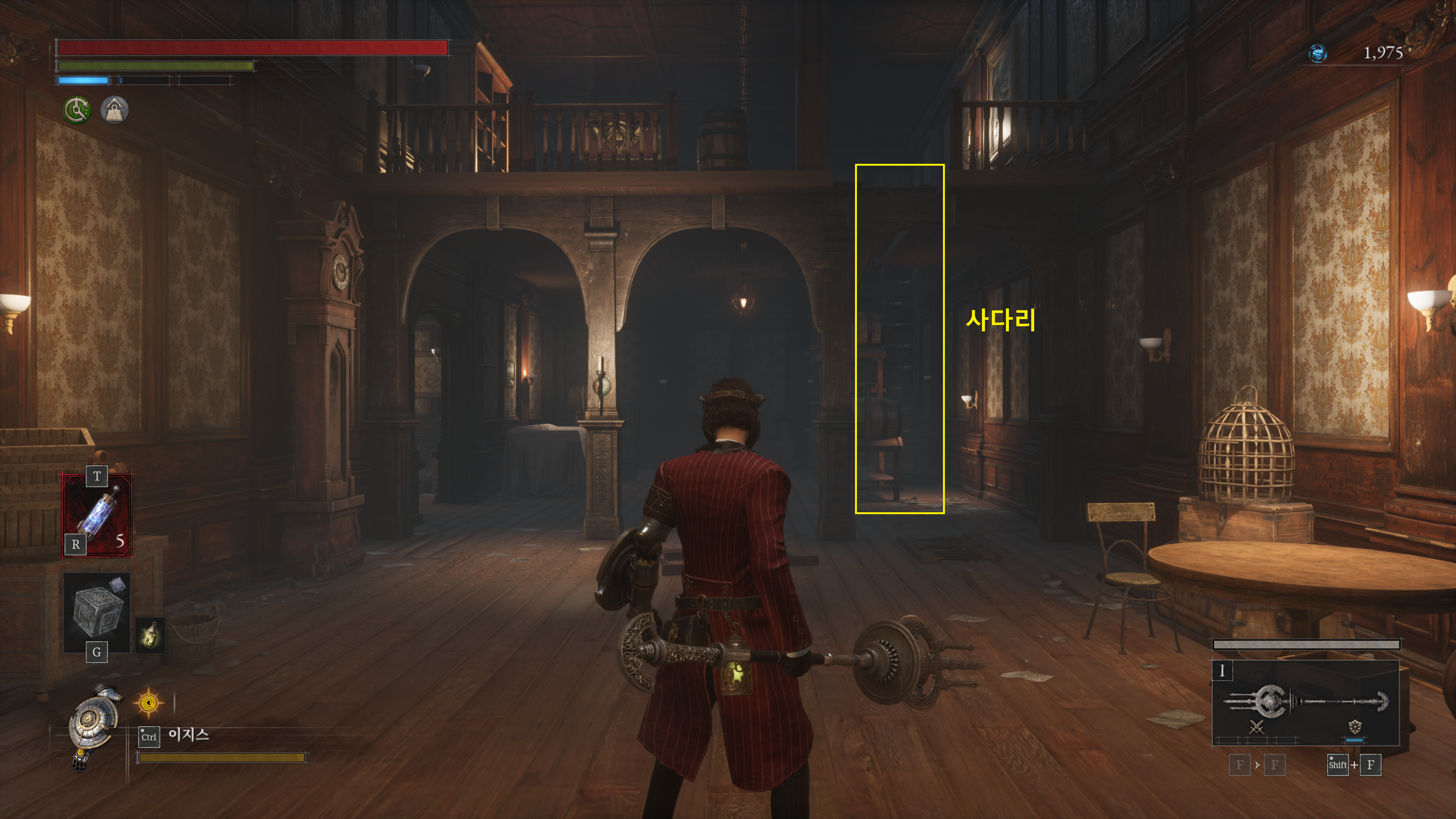들어가자마자 오른쪽 끝에 사다리를 타고 올라가면 암상인과 보물 상자가 있습니다.